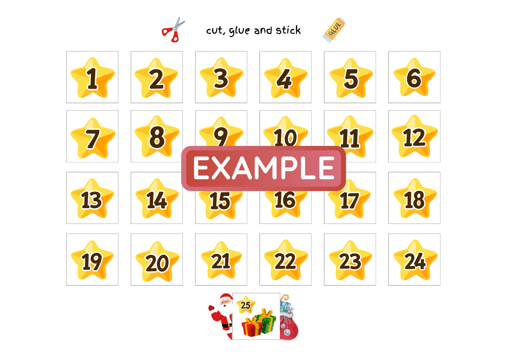 A fun Christmas countdown calendar with a choice of crossing off the numbers or as a cut and stick activity.