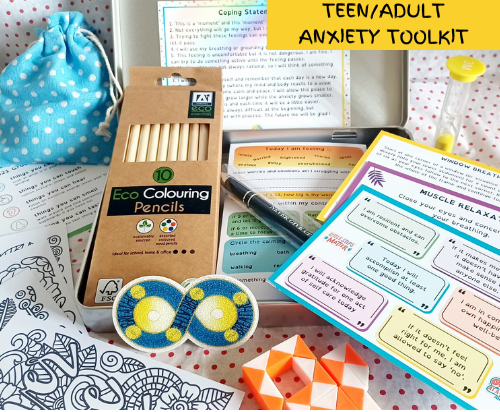 1. Teen/Adult Anxiety Toolkit (a tin full of mindfulness activities to support through those anxious moments, including a coping statements postcard and anxiety notepad).